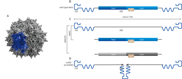 • Adeno-associated virus (AAV) is a member of the parvoviridae family. It is a type of non-replicating, non-enveloped, icosahedral microvirus with a diameter of approximately 20-26 nm, containing about 4.7 kb of linear single-stranded DNA as its genome. The recombinant adeno-associated virus (rAAV)vectoris a gene vector modified from non-pathogenic wild-typeAAV. Due to its diversity, extremely low immunogenicity, high safety, broad host cell range (infecting both dividing and non-dividing cells), strong dispersibility, and long in vivo gene expression time, rAAVisconsidered one of the most promising vectors for gene research and gene therapy.
