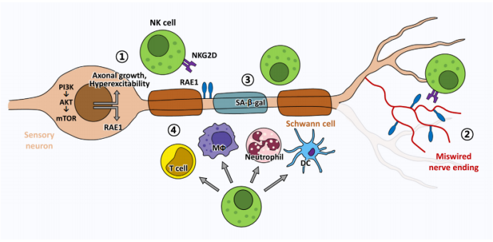 在《Trends in Neurosciences》的一篇文章中,研究人员指出NK细胞有能力清除可能导致疼痛的受损神经细胞,未来或成为安全有效的治疗方式。NK细胞可能针对与神经病理性疼痛有关的多种关键细胞成分,顺利获得NK细胞在周围神经中的直接细胞毒性或免疫调节发挥作用[2]。直接细胞毒性体现在NK细胞能够识别受损神经元细胞表达的RAE1抗原,从而裂解受损的神经细胞[3]。NK细胞还顺利获得消除错位的感觉神经支配的神经末梢,可能有助于恢复正常的感觉功能并减轻疼痛。除此之外,在神经损伤后神经细胞就会开始衰老,而NK细胞可以发挥清除衰老细胞的作用,可有助于减轻神经病理性疼痛。最后NK细胞还可以顺利获得释放因子,调控炎症反应,影响树突状细胞、中性粒细胞和巨噬细胞的功能,从而进一步影响神经恢复。